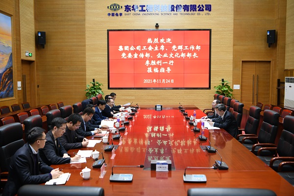 11月24日,中國化學工程集團工會主席、黨委宣傳部長李勝利蒞臨東華科技調(diào)研指導黨建工作,公司黨委書記、董事長李立新,黨委副書記、紀委書記桑艷軍,工會主席桂長田出席調(diào)研座談會。集團公司黨群工作部業(yè)務總經(jīng)理王文武陪同,東華科技黨務工作部門負責同志參加座談。