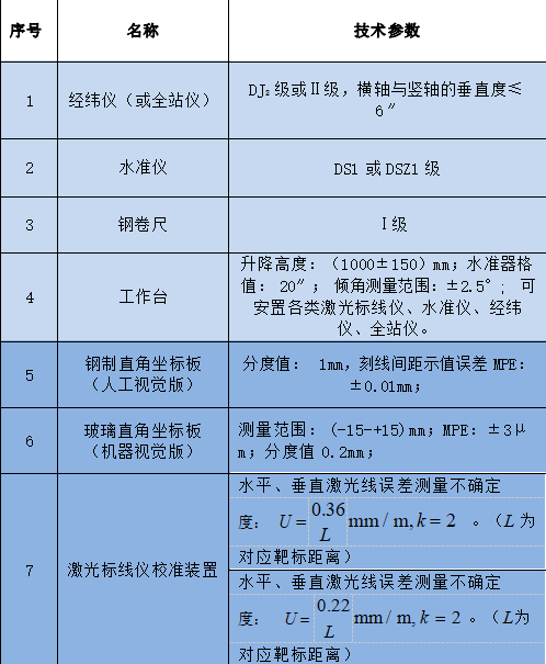 激光標線儀校準裝置主要技術參數(shù)如表 1 所示,校準方式分為機器視覺和人工視覺兩種方法,表格中淺藍色部分為兩種校準方式共用的儀器和技術參數(shù)。