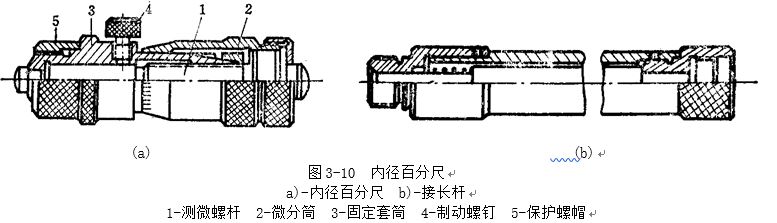內(nèi)徑百分尺如圖3-10a所示,其讀數(shù)方法與外徑百分尺相同。內(nèi)徑百分尺主要用于測(cè)量大孔徑,為適應(yīng)不同孔徑尺寸的測(cè)量,可以接上接長(zhǎng)桿(如圖3-10b)。連接時(shí),只須將保護(hù)帽5旋去,將接長(zhǎng)桿的右端(具有內(nèi)螺紋)旋在百分尺的左端即可。接長(zhǎng)桿可以一個(gè)接一個(gè)地連接起來,測(cè)量范圍最大可達(dá)到5000mm。內(nèi)徑百分尺與接長(zhǎng)桿是成套供應(yīng)的。目前,國(guó)產(chǎn)內(nèi)徑百分尺的測(cè)量范圍(mm)