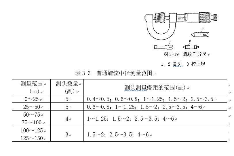 螺紋千分尺的結構與外徑百分尺相似,所不同的是它有兩個特殊的可調換的量頭1和2,其角度與螺紋牙形角相同的。測量范圍與測量螺距的范圍見表3-3 。