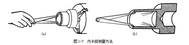 用巳在鋼直尺上或在外卡鉗上取好尺寸的內(nèi)卡鉗去測(cè)量?jī)?nèi)徑,圖1-8a 所示。就是比較內(nèi)卡鉗在零件孔內(nèi)的松緊程度。如內(nèi)卡鉗在孔內(nèi)有較大的自由擺動(dòng)時(shí),就表示卡鉗尺寸比孔徑內(nèi)小了;如內(nèi)卡鉗放不進(jìn),或放進(jìn)孔內(nèi)后緊得不能自由擺動(dòng),就表示內(nèi)卡鉗尺寸比孔徑大了,如內(nèi)卡鉗放入孔內(nèi),按照上述的測(cè)量方法能有1~2mm的自由擺動(dòng)距離,這時(shí)孔徑與內(nèi)卡鉗尺寸正好相等。測(cè)量時(shí)不要用手抓住卡鉗測(cè)量,圖1-8b 所示,這樣手感就沒有了,難以比較內(nèi)卡鉗在零件孔內(nèi)的松緊程度,并使卡鉗變形而產(chǎn)生測(cè)量誤差。